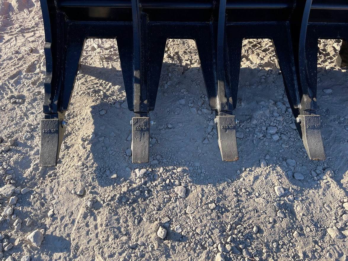 Two independent grapples. We use twin 2” bore by 10” stroke cylinders, rated at 4000 psi to handle the toughest jobs. Our Severe Grapple Rakes are built with 3/4″ top quality steel and comes standard with 23 series teeth. Our Grapple Rake fully opens to 43″ inches and rated for 80 hp and up.